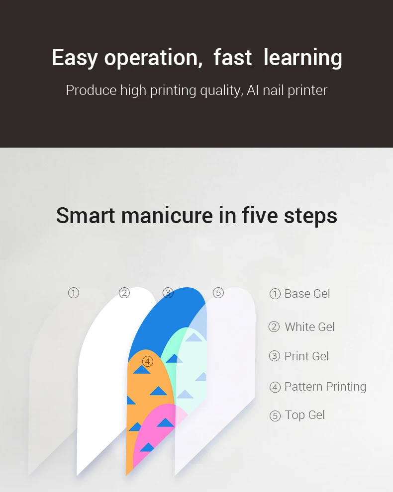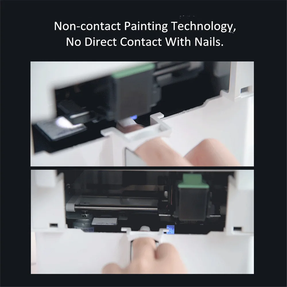 *Visual design, you can see the printing process clearly, full of security *Touch screen operation, one-touch manicure, easy to learn. Beginners can also get started easily *Can be connected to a wired network or wireless WIFI. Smart terminal that can be operated independently without using a computer or mobile phone *AI intelligent identification, accurate coloring. Accurately recognize the contours of the edges of your nails and will not stain your fingers. *Non-contact painting technology, no direct contact with nails.